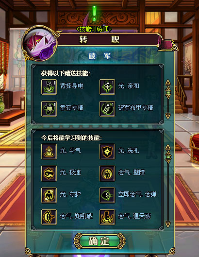 现在,在使用转职道具后,您将可以看见全新的漂亮转职界面啦!界面中会详细提示您转职后能够获得的转职技能,以及在将来升级道路上能够学到的强大招式。趁此机会,赶紧规划下自己转职后的道路吧!