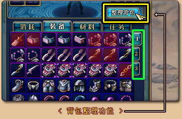 背包整理功能:背包大了,物品多了,找点东西可就麻烦了。不过不用担心,我们将与背包扩充同步推出背包整理功能。点击按钮,背包中的物品就会按照一定的规则整齐排列。再也不怕弄错物品啦!